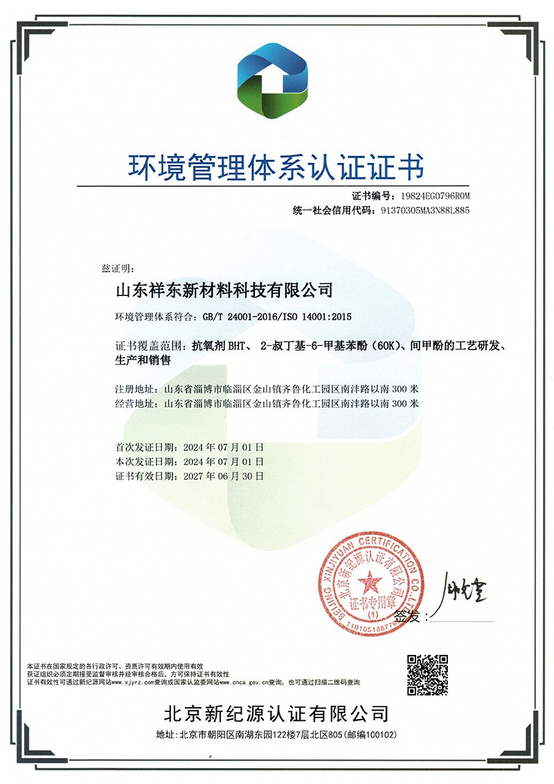 山東祥東新材料科技有限公司1.2萬噸/年6-叔丁基鄰甲(60K)、4-叔丁基鄰甲酚(偏 24 酚)和 4,6-二叔丁基鄰甲酚(偏 246 酚)烷基甲酚項目竣工環(huán)境保護驗收監(jiān)測報告