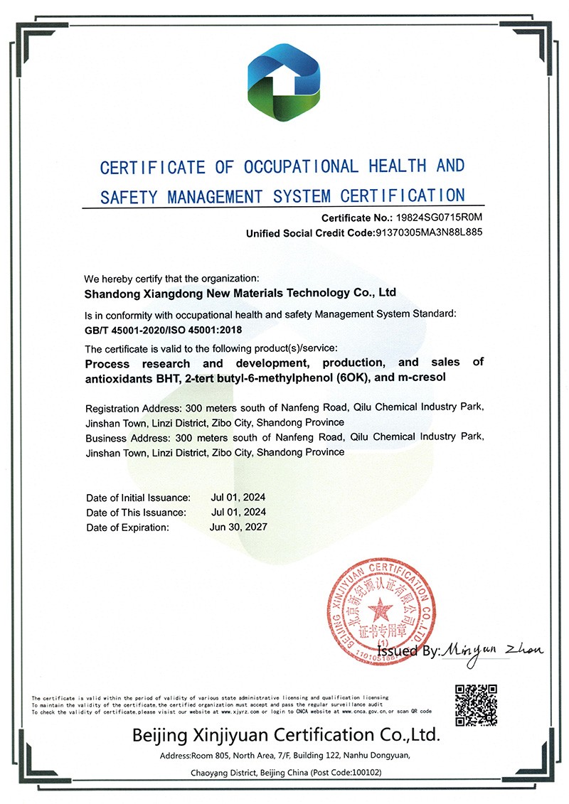 山東祥東新材料科技有限公司1.2萬噸/年6-叔丁基鄰甲(60K)、4-叔丁基鄰甲酚(偏 24 酚)和 4,6-二叔丁基鄰甲酚(偏 246 酚)烷基甲酚項(xiàng)目竣工環(huán)境保護(hù)驗(yàn)收監(jiān)測(cè)報(bào)告