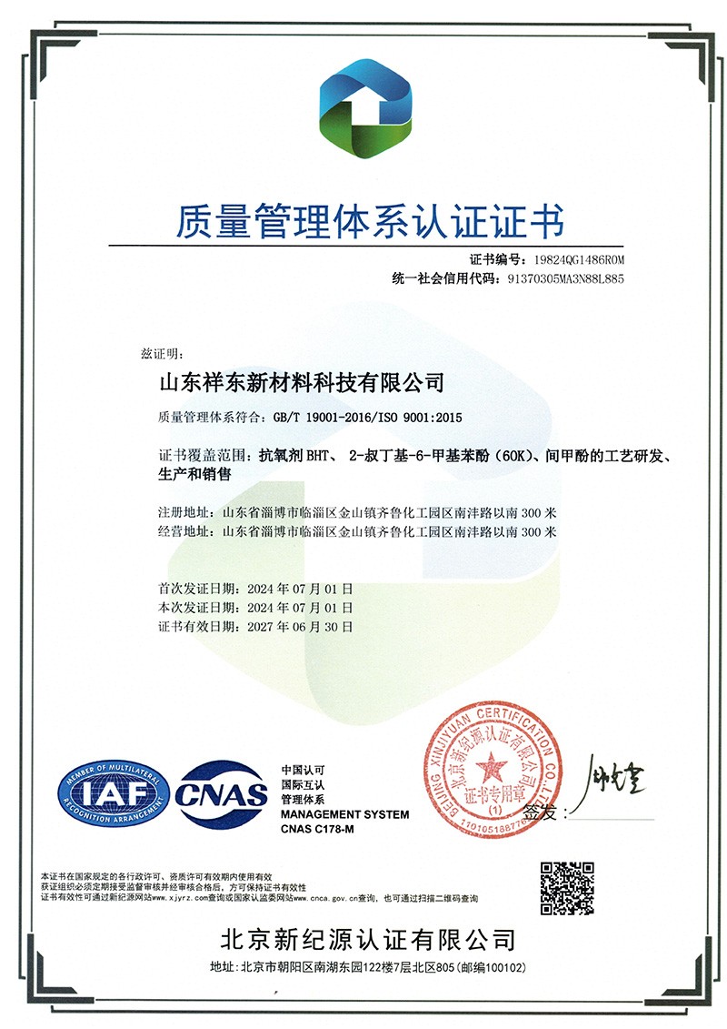 山東祥東新材料科技有限公司1.2萬噸/年6-叔丁基鄰甲(60K)、4-叔丁基鄰甲酚(偏 24 酚)和 4,6-二叔丁基鄰甲酚(偏 246 酚)烷基甲酚項目竣工環(huán)境保護驗收監(jiān)測報告